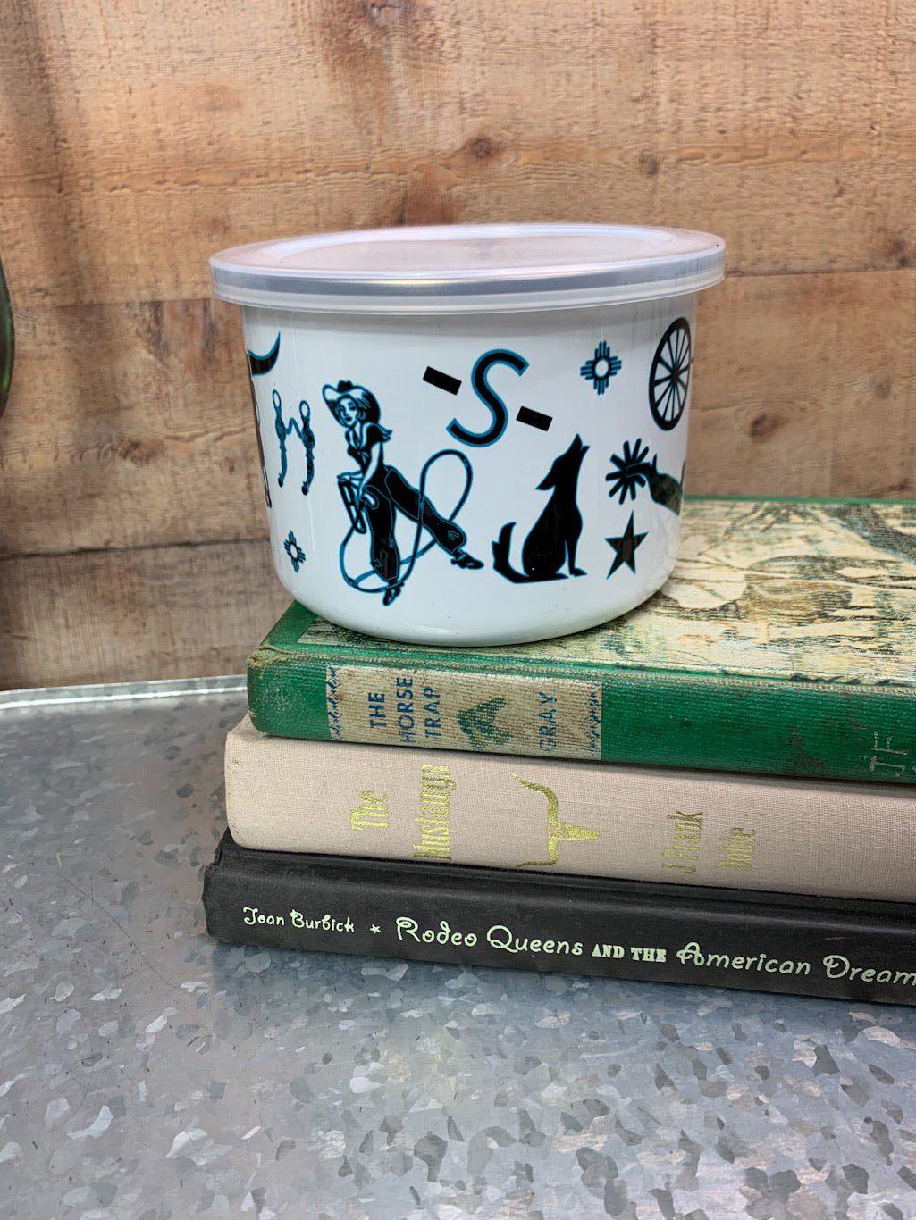 An R&R original design on a metal bowl with lid. Great western style for storage, snacks or decoration. The uses are endless. Two sizes to choose from. Hand wash.