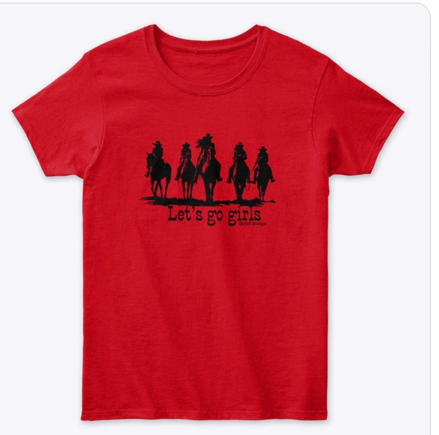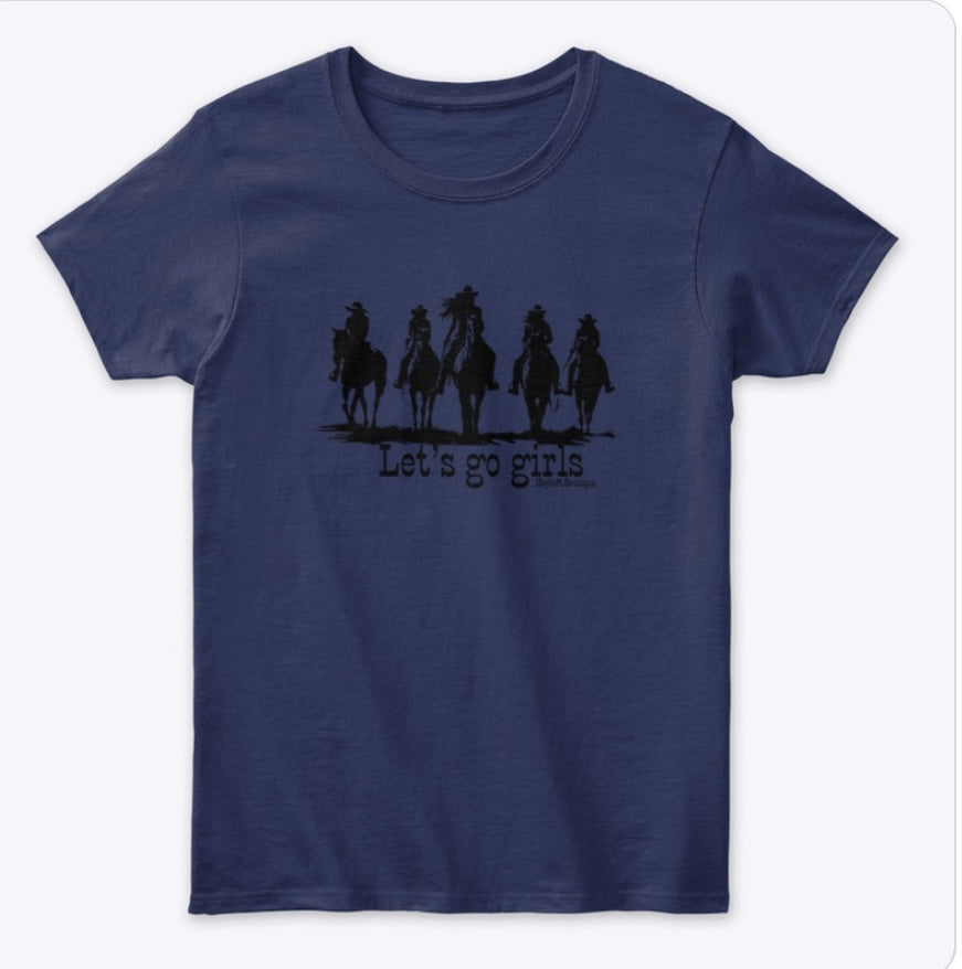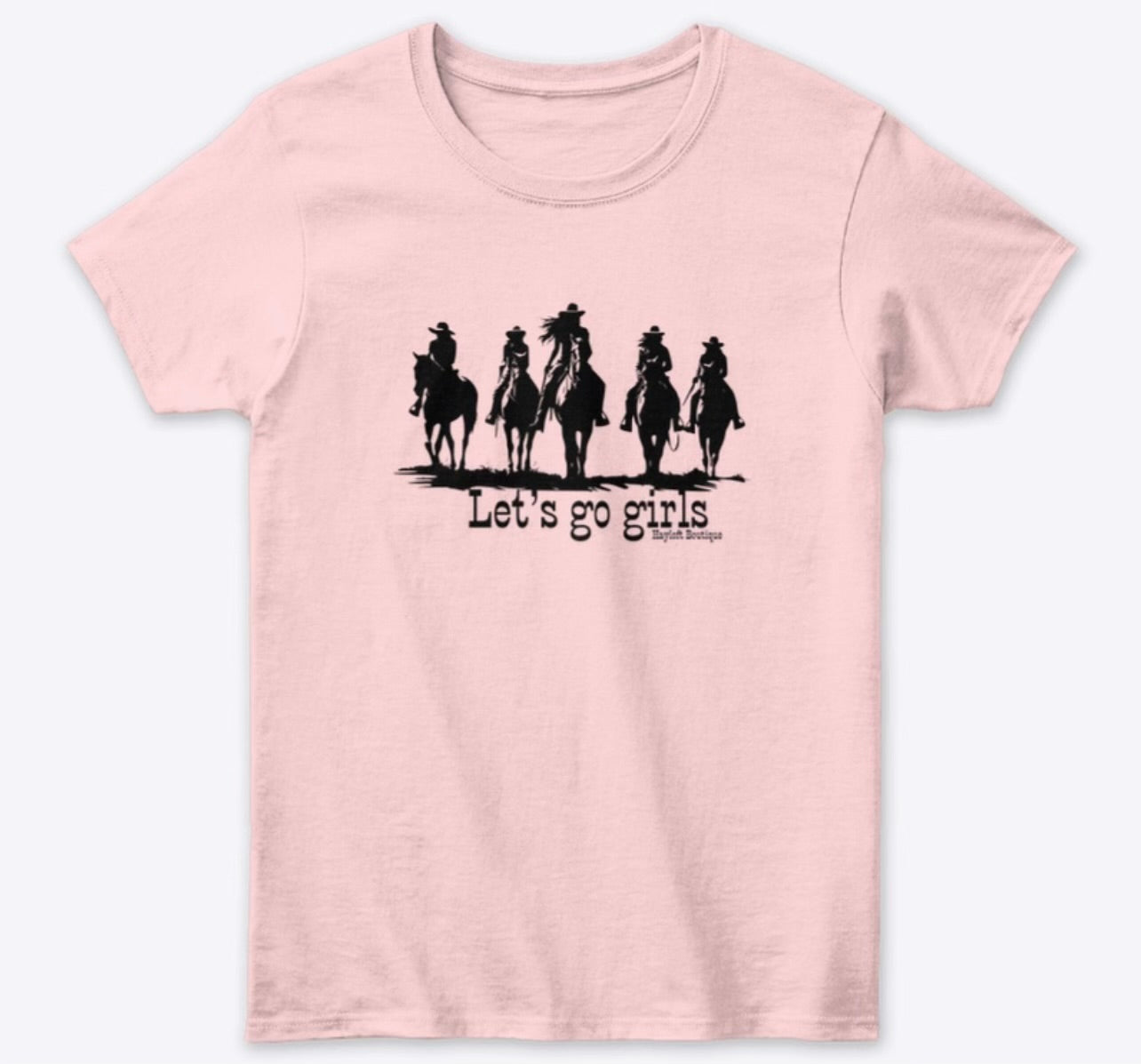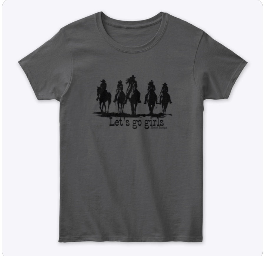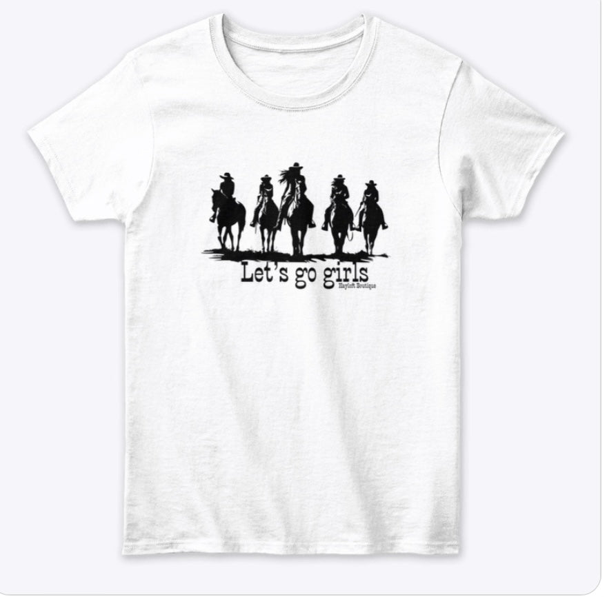 "Unleash your inner cowgirl with our Let's go girls t-shirt. Featuring a bold 'Let's go girls' slogan and a beautiful horse print, this shirt will make any horseback riding adventure even more exciting. Made with high-quality materials for durability and comfort."