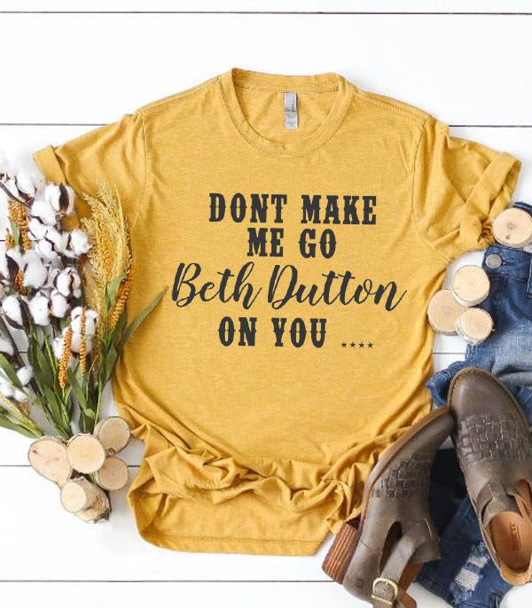Show off your love for Yellowstone with the iconic Beth Dutton T-shirt! Made for the ultimate fan, this custom shirt features the infamous quote, "Don't Make me go Beth Dutton on you." Available in select sizes, you won't want to miss out on this must-have for any Yellowstone enthusiast.